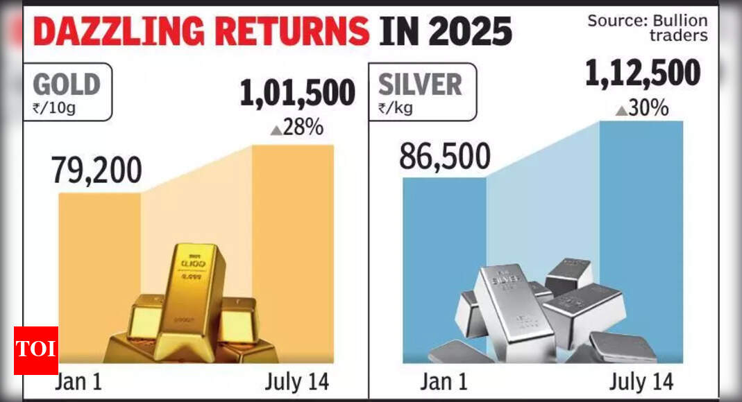 Ahmedabad: Silver outpaced gold in returns this year, with prices in Ahmedabad climbing 30% since Jan 1 to touch a record Rs 1.125 lakh per kilogram on Monday. In comparison, gold gained 28% during the same period, rising from Rs 79,200 for 10g at the start of the year to reach the current Rs 1.015 lakh. The latest spike saw silver prices rise by Rs 2,500 in a single session to go up from Saturday's Rs 1.10 lakh. The white metal's stronger performance is backed by surging industrial demand and tight global supplies. "Silver's outperformance is largely due to increased consumption in sectors like solar energy and electronics. Last week, US President Donald Trump imposed a 50% tariff on copper imports, which will take effect on Aug 1. Since silver and copper are both widely used in industrial applications, especially in electronics and clean energy sectors, if copper becomes more expensive due to tariffs, manufacturers are likely to look for cheaper alternatives like silver," said Haresh Acharya, director of Indian Bullion and Jewellers Association (IBJA).Nearly 60% of silver's global demand now comes from industrial applications, particularly green technologies. "With India's bullish push for green energy through solarisation, silver consumption has sizeably increased in the country. With international prices hovering around $39 an ounce, silver is clearly emerging as a safe-haven investment and an essential input for industry," Acharya added. Meanwhile, gold price also increased to Rs 1.015 lakh per 10g on Monday. The increasing price of the yellow metal has impacted retail demand for gold. According to jewellers, both gold and silver are gradually getting out of reach of common customers."A combination of industrial use and investment demand has fuelled the sharp rise, with silver ETFs attracting increasing investor interest as the metal gains attention for its growth potential. Gold and silver are clearly out of reach of customers. Exchange transactions have gone up substantially to 80% over the past six months, since when gold and silver prices increased. People come with old jewellery for repairing it or exchanging it for new. Jewellery trade is clearly muted," said Manoj Soni, member of the Jewellers' Association Ahmedabad (JAA).