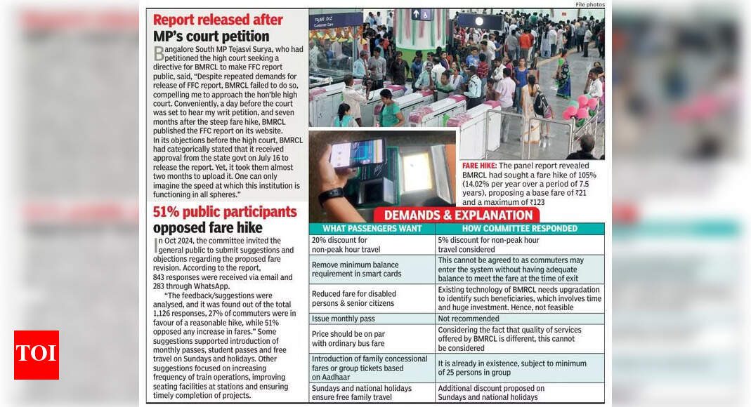 Bengaluru: After steeply hiking Namma Metro fares by up to 71 per cent in Feb -- making it the most expensive Metro in the country -- Bangalore Metro Rail Corporation Ltd (BMRCL) may now make fare hikes a yearly affair. In Feb, accepting a report submitted by the fare fixation committee (FFC), BMRCL raised fares with a base price of Rs 10 and a maximum fare of Rs 90. The committee also recommended implementing an annual automatic fare revision formula to maintain financial stability. The committee suggested until the next FFC is formed, BMRCL should increase Metro fares annually by 5 per cent. ...Read More >