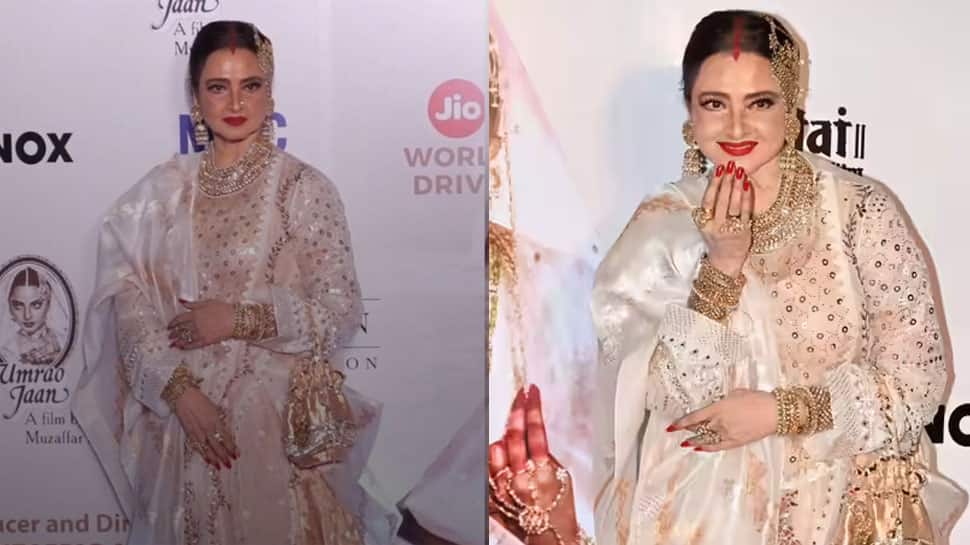 Mumbai: Bollywood actress Rekha's cult film 'Umrao Jaan' is all set to enchant the audience once again on June 27. Director Muzaffar Ali and Rekha hosted a special re-release screening of the film today in Mumbai. The event was graced by AR Rahman, Tabu, Anil Kapoor and others. Rekha stunned everyone in a traditional white outfit with golden embroidery that reminded of her iconic character of Umrao Jaan from the film. She posed for the camera with the director and ace music composer AR Rahman. Rekha can also be seen dancing with Anil Kapoor in a fun moment. Superstar Aamir Khan looked dash ...Read More >
