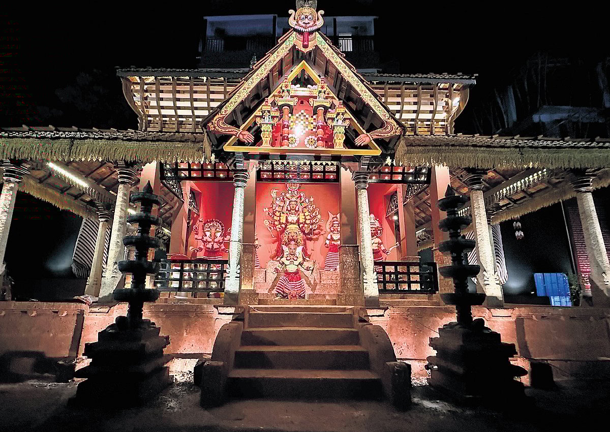 KANNUR: The city of joy is ablaze with Durga Puja festivities. Pandals glitter with lights, dhaak beats echo through every lane, and the air carries the fragrance of dhuno. Yet, amid the familiar grandeur, this year's celebrations hold something never seen before -- Kerala's theyyam has found its place in Bengal's most important festival. At South Kolkata's famed 66 Pally Club's Durga Puja, the pandal itself tells the story. Built in the style of a traditional Kannur temple, its architecture draws directly from Kerala's vastu vidya. Crafted over three months by a team of carpenters from Thala ...Read More >