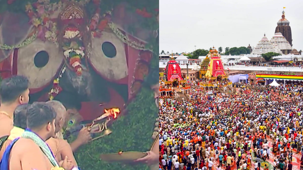 Puri: A day before the :Rath Yatra of Lord Jagannath, thousands of devotees thronged Puri to witness the reappearance of sibling deities at the 12th-century shrine here on Thursday. They reached the 'Singha Dwar' (Lion's Gate) of the temple before the sun rose to have a 'Nabajouban darshan' (youthful appearance) of Lord Balabhadra, Devi Subhadra and Lord Jagannath on the 'Ratna Bedi' (sacred platform in sanctum sanctorum). The deities appeared before the devotees after a fortnight. The public 'darshan' of the sibling deities was stopped after bathing rituals on June 11. "It is believed that t ...Read More >